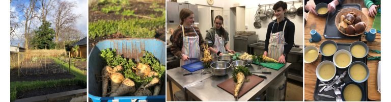 From school plot to soup pot: these gigantic parsnips, grown by pupils in the school vegetable plots as part of their timetabled gardening lesson, along with a selection of winter vegetables from the other 14 campus plots were harvested, prepared, cooked and served by pupils to their peers for school lunch.