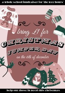 The Student Council invites all pupils and teachers to wear their best Christmas jumpers on the 6th of December and bring in a £1 donation (unless you’re feeing generous!). Everything collected will go to a charity called “The Wee Hours” that aims to help people staying on the streets of Edinburgh.