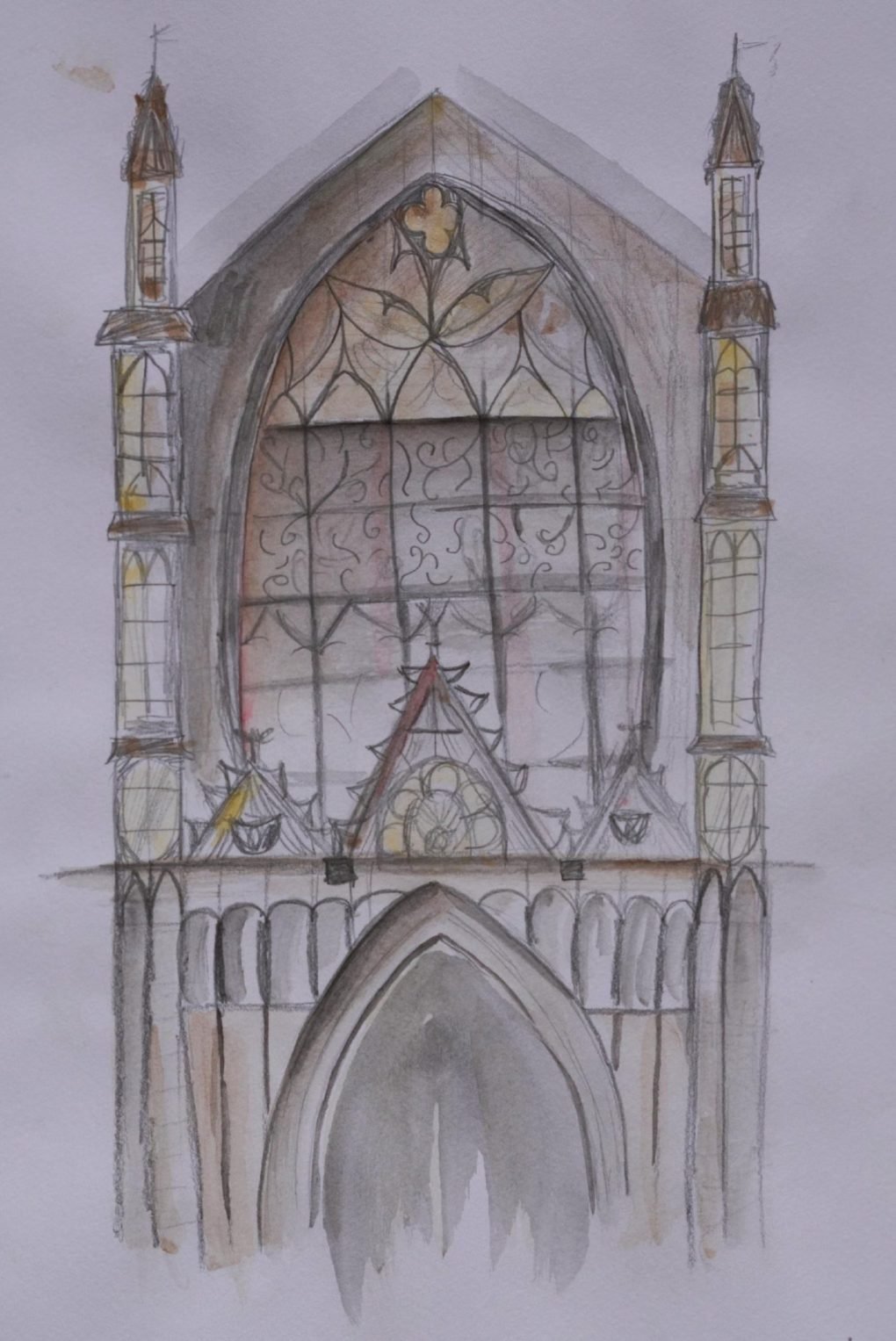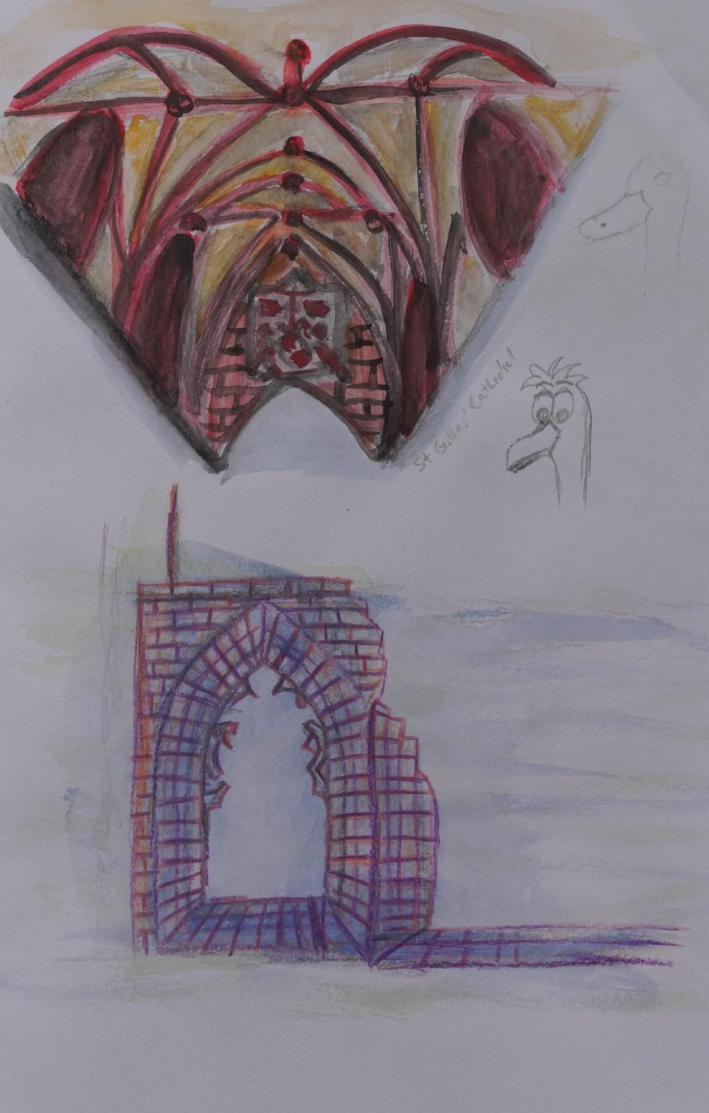 Attention is paid to details, proportions and perspectives. Organic shapes, irregular lines and divergent angles are embraced in the Scottish Parliament, reflecting its contemporary design. Contrast this style with the intricate details, shading for depth and perspective to capture the grandeur of the Cathedral.