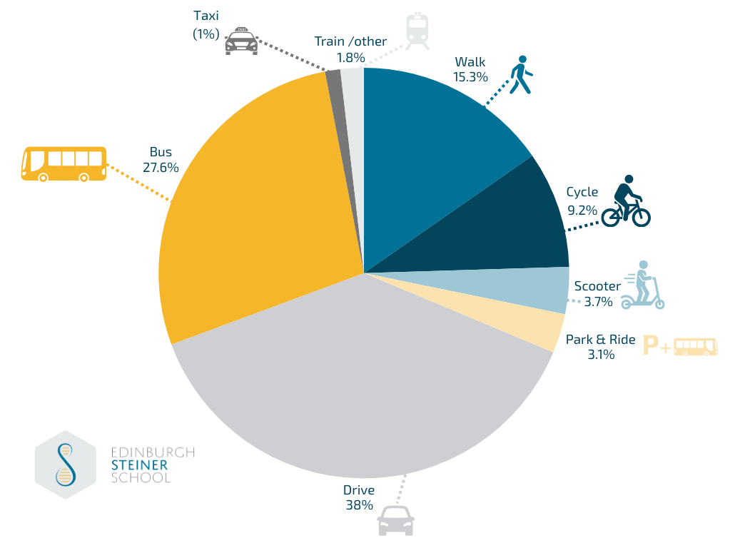 Taking into account some pupils take a blend of transport on either/both journeys, over a quarter (25.6%) walk, scooter or cycle; 2-in-5 travel by public transport (bus or train) at leats part of the way. 39.5% go to or from school by car, down over 20% from last year, despite some pupils travelling up to 29 miles each way. Many of the pupils who only travel by car, travel three or more miles to school. The Park & Ride scheme and Car sharing helps to reduce our collective school-run carbon footprint.